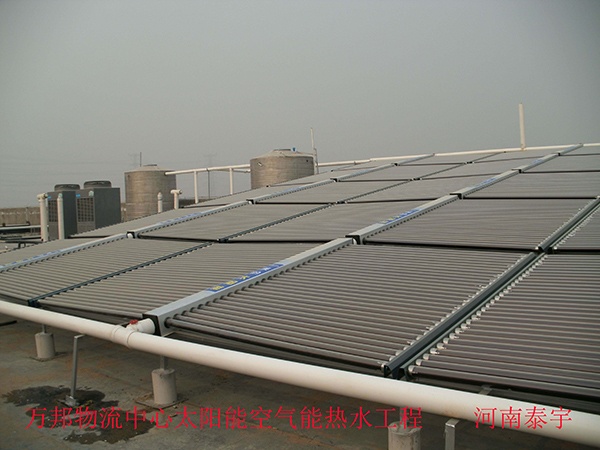 萬邦物流園2:該圖為萬邦物流園君悅賓館太陽能+空氣能熱泵熱水系統(tǒng)施工完畢圖,太陽能集熱面積約168m2,本項目采用真空管太陽能與美的空氣能熱泵(10P熱泵兩臺)相結合,屬于節(jié)能項目,年節(jié)能率高達百分之90以上。該熱水項目晴好天氣時每天可產(chǎn)12T左右的熱水,完全可以滿足甲方使用要求,達到大節(jié)能效果。