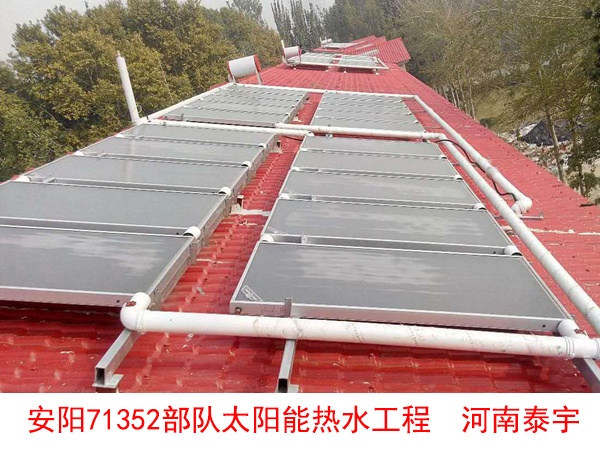 安陽71352部隊太陽能熱水工程:該圖為安陽71352部隊太陽能熱水工程,該項目主要提供集中洗浴熱水,采用榮事達(dá)平板集熱器與電輔助加熱相結(jié)合,共有六個系統(tǒng),單個系統(tǒng)熱水量日供4T左右,節(jié)能效果顯著!