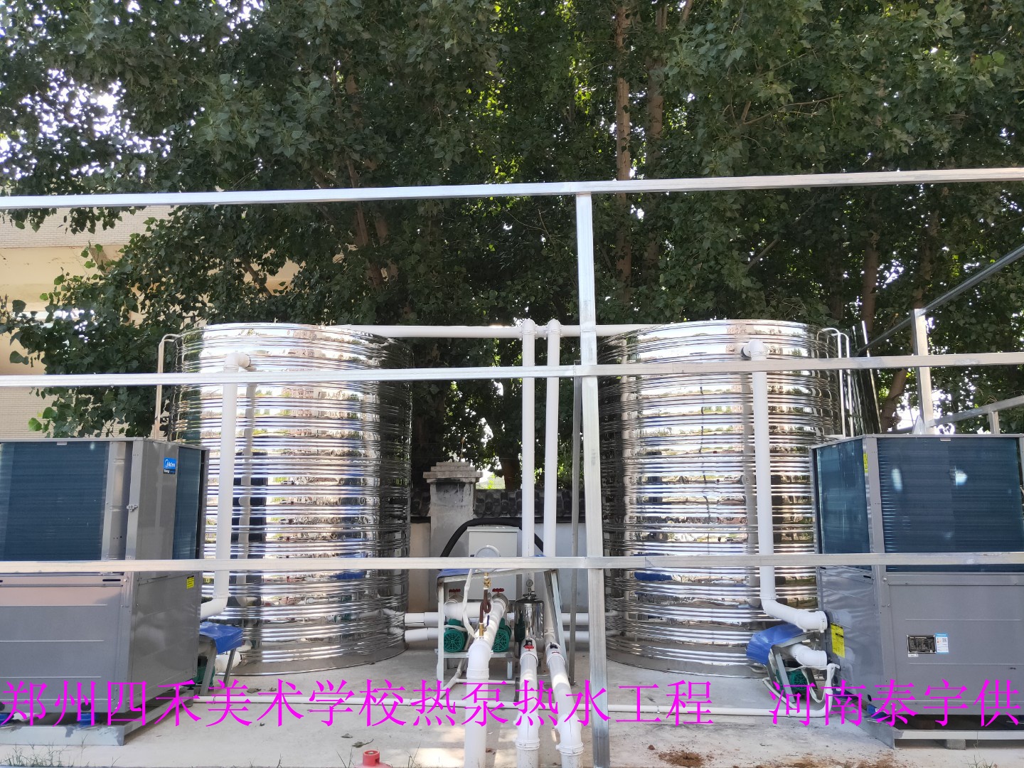 鄭州四禾美術(shù)學(xué)校位于鄭州市三全路,在校學(xué)生共計(jì)1000多人,熱水主要滿足學(xué)生男女宿舍樓使用。該項(xiàng)目采用美的空氣能熱泵機(jī)組10P兩臺。該學(xué)校熱水系統(tǒng)共計(jì)兩套,每套系統(tǒng)日產(chǎn)熱水量約為18T,每天可以滿足600學(xué)生同時(shí)使用。