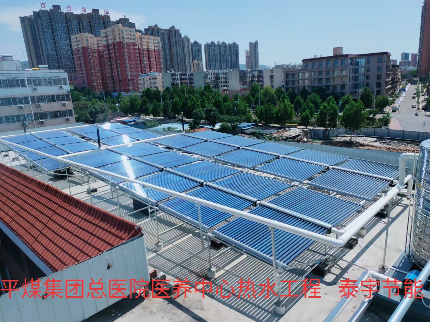 平煤總醫(yī)院醫(yī)養(yǎng)中心位于平頂山七礦咱,太陽能集熱面積約為150平方,空氣能熱泵機(jī)組10P兩臺(tái),主要滿足醫(yī)院病房樓生活熱水所需。晴好天氣時(shí),日產(chǎn)標(biāo)準(zhǔn)洗浴熱水約為16T,強(qiáng)冷及陰雨天采用空氣能熱泵機(jī)組作為補(bǔ)充來滿足全年熱水所需。