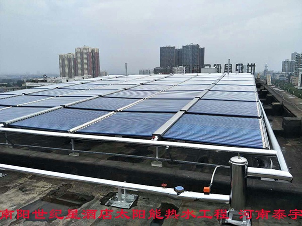 南陽世紀星酒店:采用太陽能與原來燃氣鍋爐相結(jié)合,日產(chǎn)熱水量約為25t。