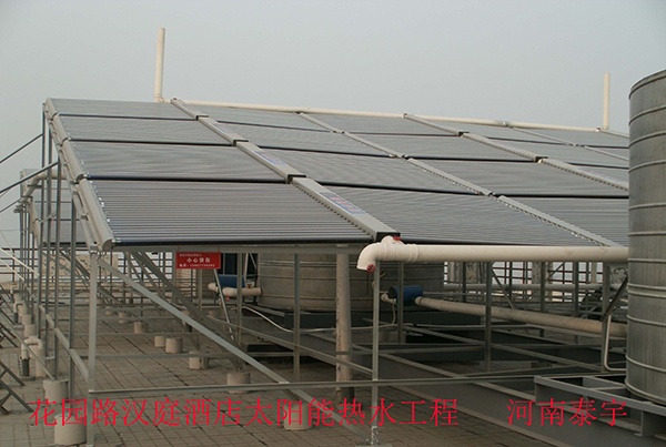 漢庭酒店:該圖為鄭州漢庭商務酒店太陽能熱水系統(tǒng)施工完畢圖,太陽能集熱面積約220m2,本項目采用力諾真空集熱管太陽能與燃氣鍋爐相結(jié)合,屬于節(jié)能環(huán)保項目,年節(jié)能率高達百分之80以上。該熱水項目晴好天氣時每天可產(chǎn)16T左右的熱水,完全可以滿足甲方使用要求,達到大節(jié)能效果。
