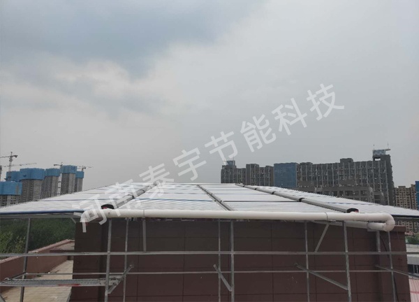 大河路田園酒店:大河路田園酒店位于鄭州市大河路與江山路交叉口,共有客房65間,根據(jù)酒店用水標準,日用熱水量約10T左右。該熱水工程采用太陽能+空氣能熱泵,太陽能集熱面積約為150平方,美的空氣能熱泵機組5P兩臺。本項目屬于節(jié)能項目,總節(jié)能約為百分之90左右。