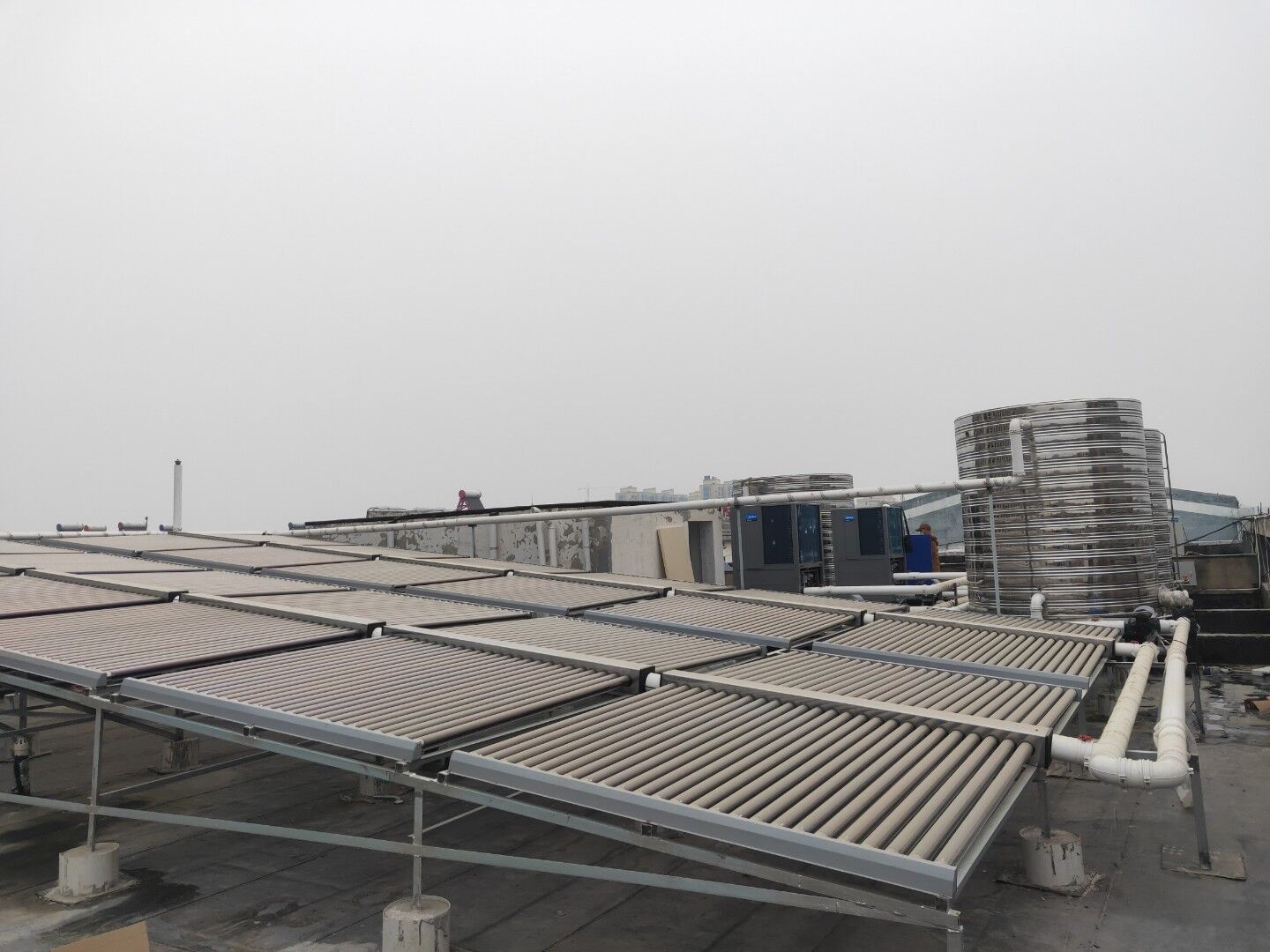 太陽(yáng)能集熱面積約為100平方,美的熱泵機(jī)組10P兩臺(tái)。每天可提供標(biāo)準(zhǔn)洗浴熱水約為15T左右,完全可以滿足一年四季熱水需求。