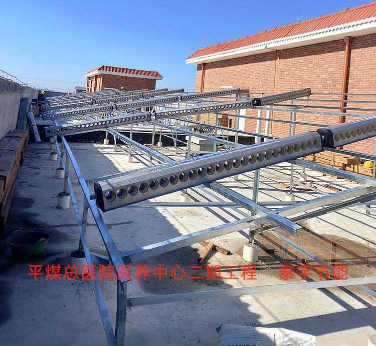 平煤總醫(yī)院醫(yī)養(yǎng)中心二期太陽(yáng)能熱泵熱水項(xiàng)目共有兩棟樓康復(fù)樓及醫(yī)養(yǎng)樓??祻?fù)樓病房100多間,醫(yī)養(yǎng)樓病房200多間,兩棟樓日用熱水量約為60T,采用空氣能熱泵機(jī)組7臺(tái),太陽(yáng)能集熱面積約為4000平方左右,日產(chǎn)熱水量約為60T/日。